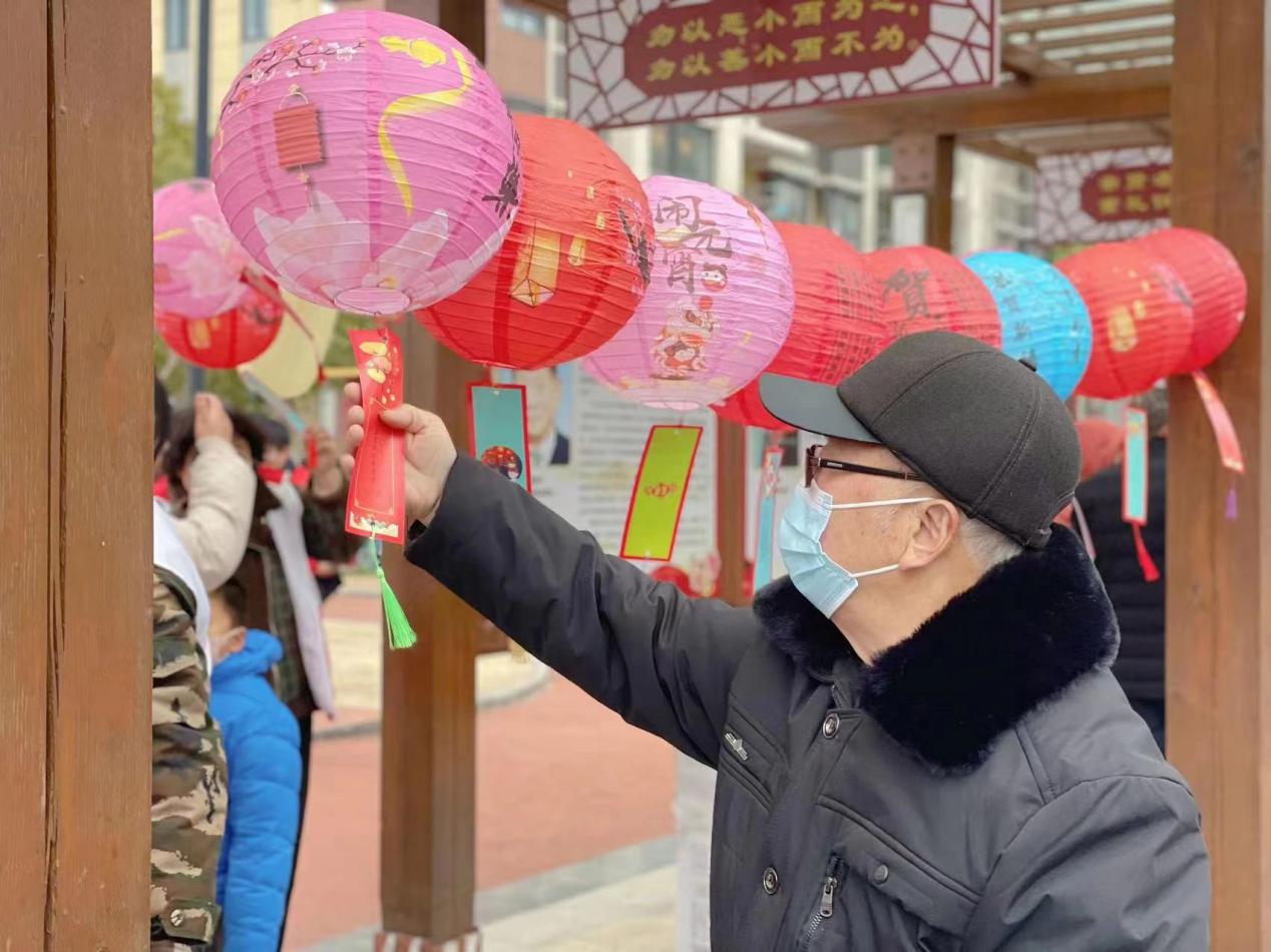 在新化社区新时代文明实践站活动现场,每个来参加活动的居民都领到了一张游园卡片,上面详细绘制了每个点的游玩地图,居民可以挑选自己感兴趣的活动前往参与。志愿者早早将各式各样的灯谜悬挂在小摊之上,成语类、生活类、科学类、民俗类等一条条灯谜跃然于纸上,大家纷纷驻足猜字谜、猜俗语、猜地名、猜民族,时而低头沉思,时而与身边人相互交流,答对灯谜的居民喜笑颜开,拿着红红火火的灯笼向彼此送上节日的祝福。