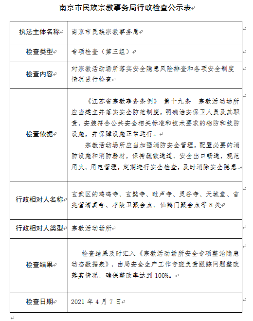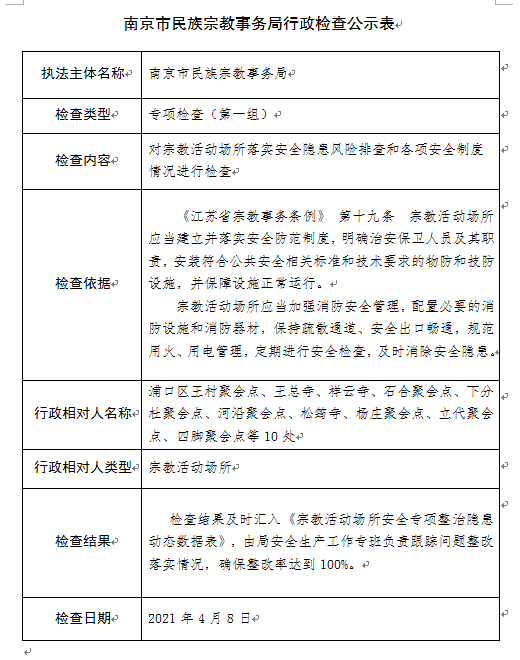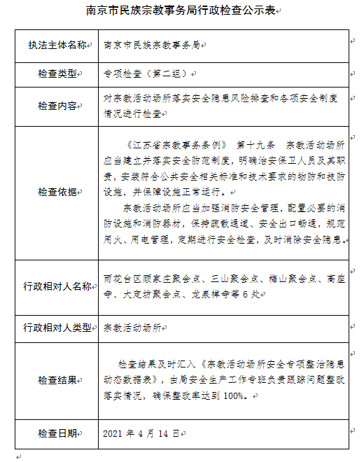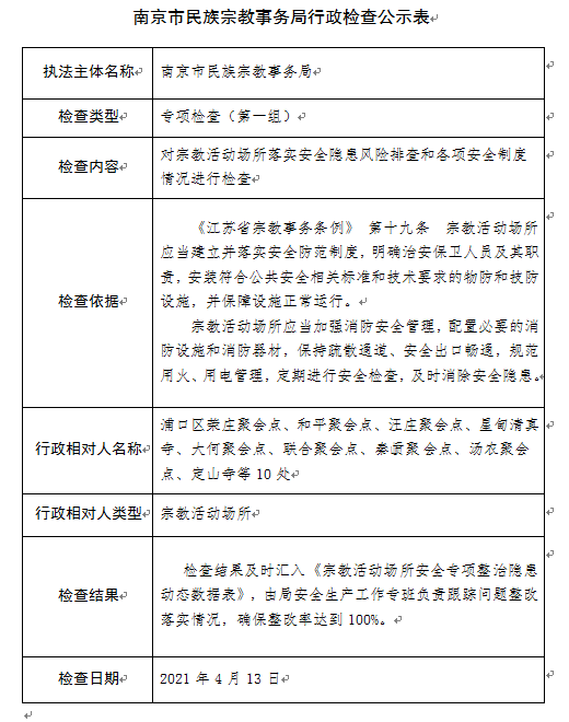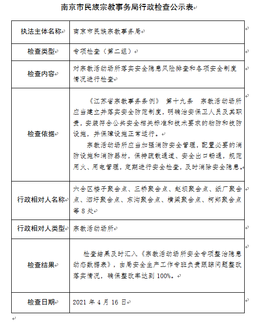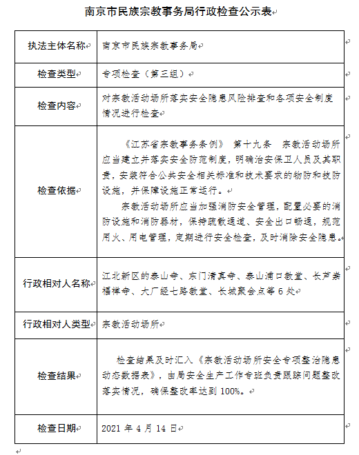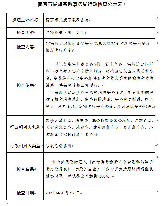 南京市民族宗教事务局行政检查结果公示(2021年4月)