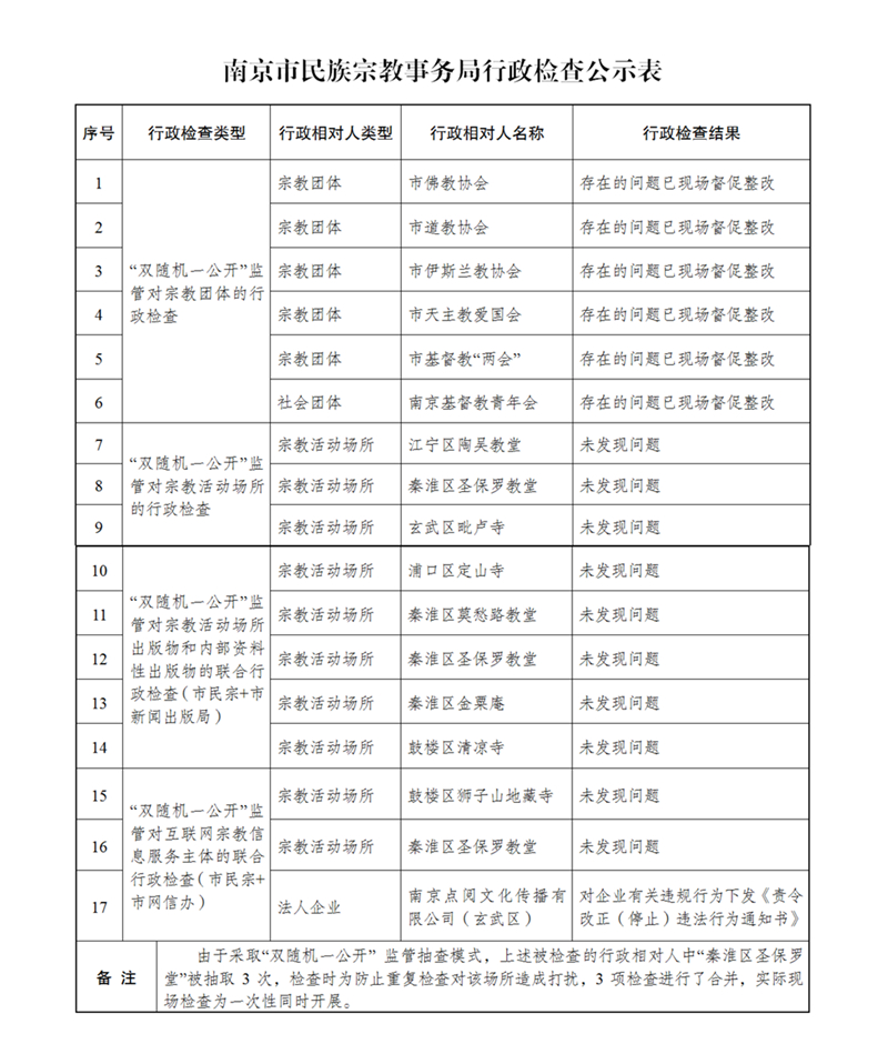 南京市民族宗教事务局行政检查公示表