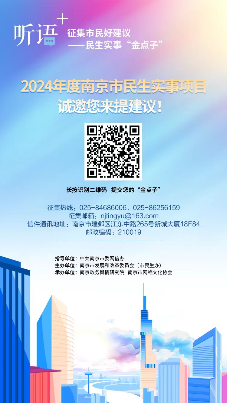 2024年度南京市民生实事项目群众建议征集活动开始了,即日起至2023年10月27日,欢迎广大市民网络“线”上说一说,“码”上提建议。