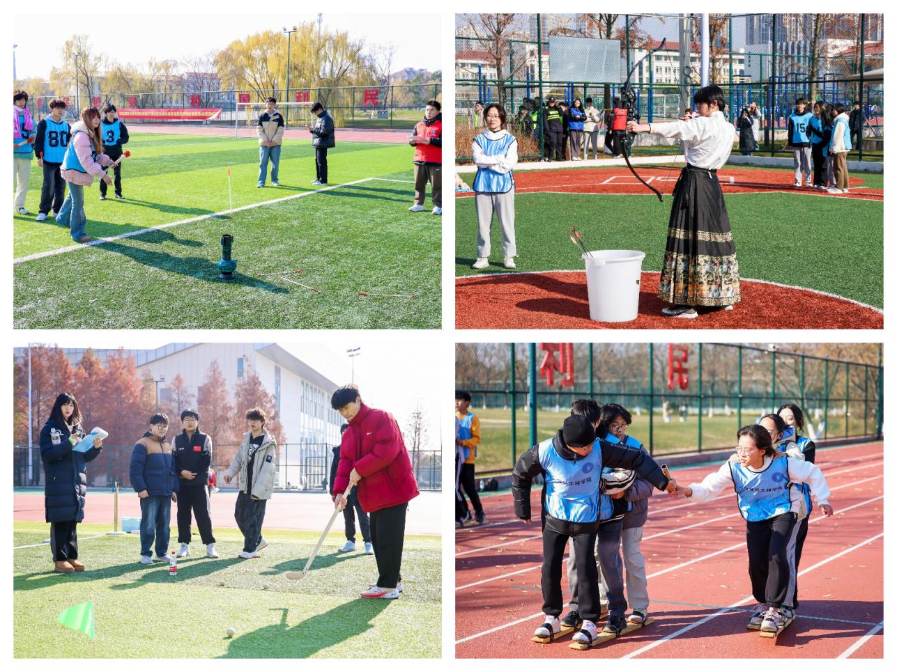 当日,金陵科技学院民族传统体育运动会同步举行。比赛现场,板鞋竞速接力赛中选手们配合默契,飞速向前;投壶项目中,运动员们沉着冷静,精准投掷;射艺场上,选手们拉满弓弦,箭矢如飞;锤丸比赛中,选手们巧妙地运用手腕的力量,展现了力量与智慧的完美结合。这些比赛项目,既是对体能和技术的双重考验,更是民族文化丰富内涵的生动体现。